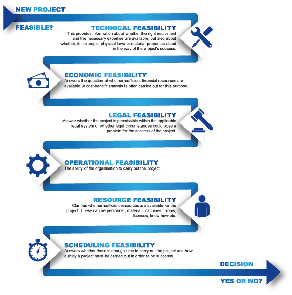 Resource feasibility: Clarifies whether sufficient resources are available for the project. These can be personnel, material, machines, rooms, licences, know-how etc.
