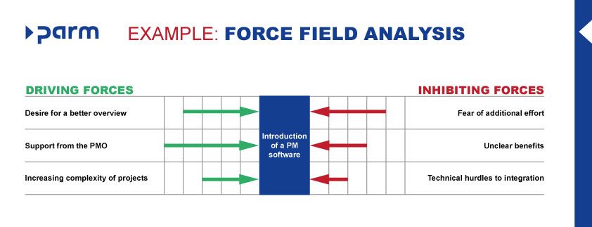Ejemplo: Si se va a introducir una nueva herramienta de proyecto, las fuerzas impulsoras pueden ser el deseo de eficacia y transparencia; las fuerzas inhibidoras podrían residir en las incertidumbres o los hábitos del equipo.