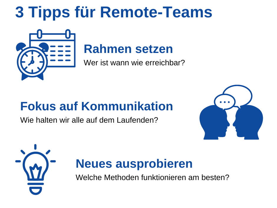 Wenn hybride Arbeitsmodelle also in Zukunft stärker eingesetzt werden, sind auch im Projektmanagement neue Wege gefragt. Daher hier drei Tipps, die bei der Organisation von Remote-Arbeit helfen: