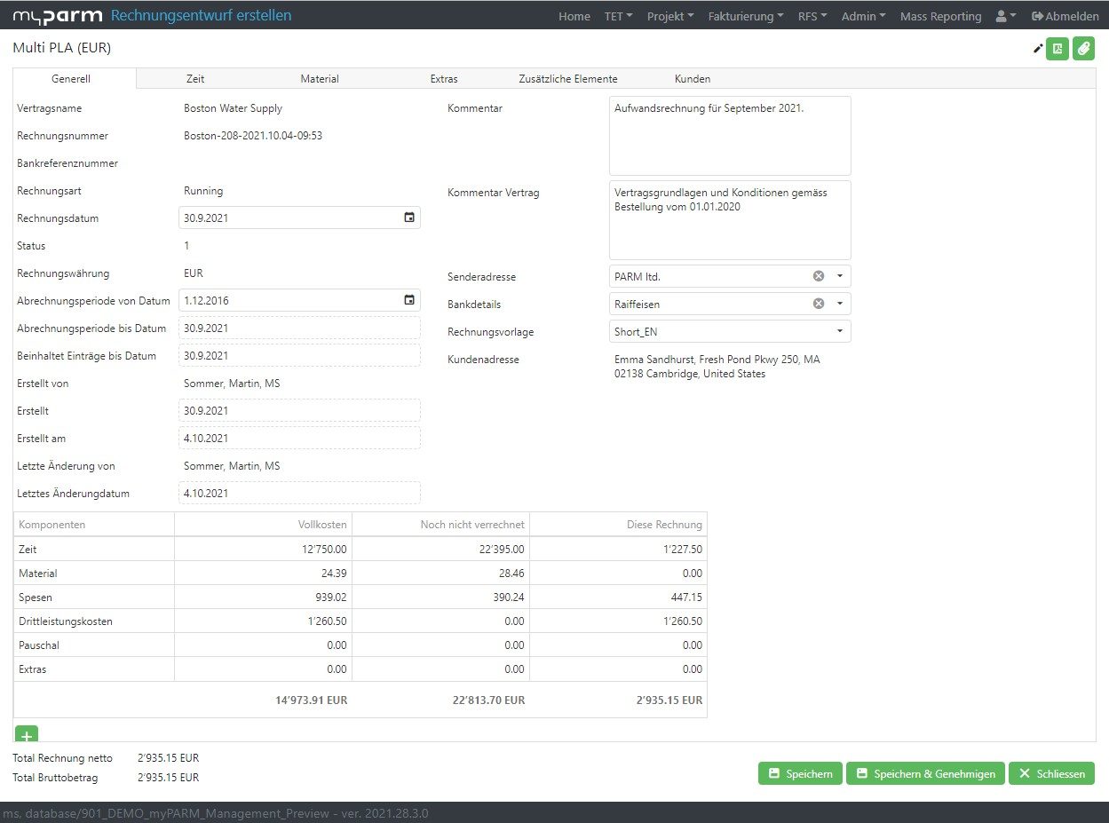 Erstellung einer Rechnung in der Projektmanagementsoftware myPARM